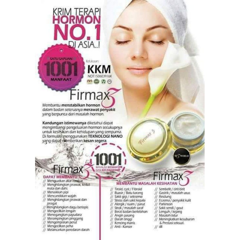 FIRMAX-3 Bisa di Sebut Sebagai CREAM Awet Muda CREAM Pencerah Kulit CREAM Untuk Kesehatan CREAM Serba Guna Yang Bekerja dengan Cara yang Sangat Unik dan memberikan Manfaat yang tidak Terduga Magic Cream FIRMAX-3 Di Formulasi Menggunakan Teknologi NANO artinya Partikel dari bahan-bahan yang di. Kulit kelihatan lebih gebu cerah. Hanya calit sedikit di nadi leher dan tangan.